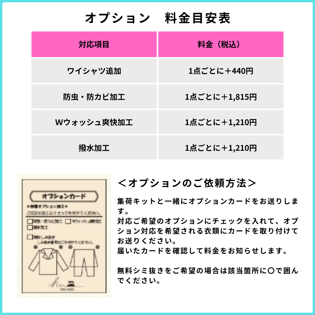 ※クリーニング品が当店に届きましたら、検品・見積りの上、クリーニング作業に入るため、基本的にキャンセルはお受けできません。やむを得ない場合はお早目のご連絡をお願いいたします。集荷キットをお送りした後のご連絡の場合、キャンセル料9,983円(宅配クリーニング5点パックの基本金額)がかかる旨、ご了承ください。