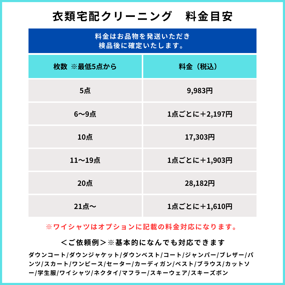 ※クリーニング品が当店に届きましたら、検品・見積りの上、クリーニング作業に入るため、基本的にキャンセルはお受けできません。やむを得ない場合はお早目のご連絡をお願いいたします。集荷キットをお送りした後のご連絡の場合、キャンセル料9,983円(宅配クリーニング5点パックの基本金額)がかかる旨、ご了承ください。
